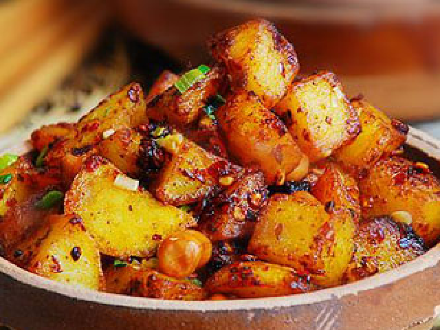 烧洋芋:“云南十八怪,其中一怪洋芋街前烧着卖”,用竹棍把洋芋串起来,或者用花刀把洋芋切成带花纹的条,然后放在油中炸熟,顾客可以买一串油炸洋芋拿在手中,一边逛街边吃,也可买一小袋洋芋条,然后用牙签戮着吃,这样就可以避免弄得满嘴都是,形成一道独特的风景线。