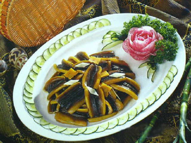 徽州水产菜类名品。相传,清乾隆皇帝下江南,一次游历到江畔,见一老农正从田中夹出一条条形似蛇的东西,问其名,才知称之蟮鱼。后经老农盛情邀请,就来到老农家中品尝其味。当菜端上桌面,乾隆皇帝突问此菜的名称,老农一时不知所措,但他望着盘中鳝鱼片因加热后皮缩肉翻,成马鞍石桥(中间高两边低的石拱桥)形状,便顺势称之为烧“马鞍桥”。后经旅居上海的绩溪徽菜师傅将其引入,并以徽菜重油烹饪,定名“马鞍鳝”,使之成为徽菜中的一道名菜。 马鞍鳝的制法为:将活鳝鱼头、尾钉在案板上,从脊背入刀剔骨,去内脏,洗净,沥干水,切成1寸2分的小段。取火腿、熟笋均切成1寸长、半寸宽、1分厚的片。炒锅放在旺火上,放入熟猪油,烧至八成热时,下鱼段炸至皮缩肉翻,倒入漏勺沥去油。在原锅中留少许油,放在中火上,下鳝鱼段,加入盐、姜、白糖、绍酒、酱油、鸡清汤,烧至八成熟时,再下大蒜瓣和火腿、熟笋片一起烧熟,*后下葱末,用湿淀粉调稀勾芡,淋上芝麻油起锅,撤上白胡椒即成,此菜色泽红润,鱼肉酥透,胶质大,味鲜醇。每逢端午节边,清水黄蟮上市,即为此菜肴供应的旺季。