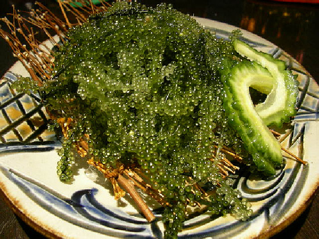 海葡萄是冲绳特产,是來到冲绳必尝的食物。海葡萄含矿质元素,具有美容强身的功效。相关的研究报道表明,海葡萄具备抗御细菌与真菌的特性,常被用于治疗高血压与风湿症。同时海葡萄也是高经济作物,有“绿色鱼子酱”美名。海葡萄可做冷菜、口味独特,*为特色菜肴!