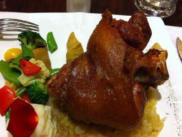 把猪脚上面的腿部用佐料腌制,再放入烤炉用旺火烤得皮脆肉嫩,呈金黄色时出炉。这道菜要趁热吃,还要陪上生菜色拉或酸白菜,减少油腻,不过也有的地方只单卖脆皮猪肘的。吃脆皮猪肘的理想搭配是喝啤酒,德国黑啤是理想选择。通常情况下脆皮猪肘的个头很大,上桌的是一大块肉食,所以如果吃不了这么多的肉,建议是两个人来吃。