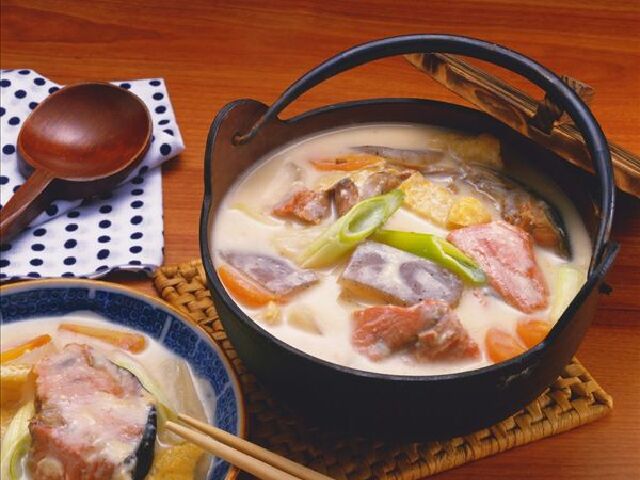 石狩锅来自于北海道的石狩川,又叫十胜锅,这一极具地方风味的菜肴是用当地所盛产的鲑鱼为原料做成的,切成段的鲑鱼,加上北海道的土豆和圆白菜,以及豆腐、魔芋、海带,放入特制的大酱,炖煮。