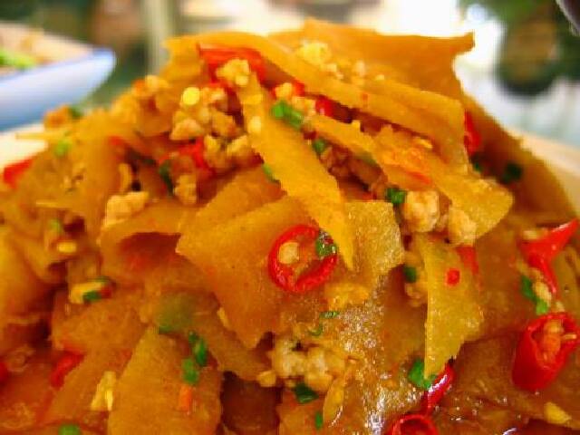 既然是桂林的美食,就应该有桂林的特色,这里用的是阳朔柚子皮,把外面黄色的一层轻轻削去,*里面的一层也削去一点,留下中间的一层,切成丝晒干,从沸水中过一下,拧干,然后跟肉丝一起炒,放点调料,这一道菜荤素搭配,还有柚子皮特有的清香,真是让人食欲大开。