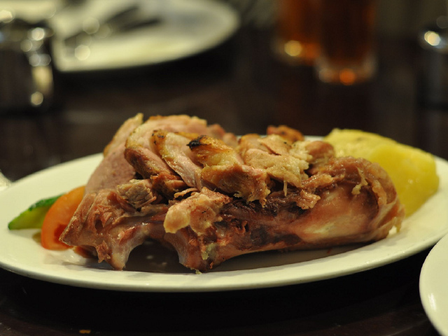 德国烤咸猪手声名远洋,切成薄片的暗红咸猪手,表面烤得相当松脆,内里则肉汁丰富,肉质松软,光看就很有食欲。如果加上一小碟黄芥辣,味道更显丰富。