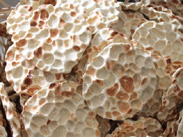 石子馍是陕西民间风味小吃,又叫砂子馍、干馍,传闻神农时就有这种馍,将调好的面粉放在烧热的石子上烙煤,油酥咸香,经久耐放。馍的表面是凹凸不平的,倒是有点像格子饼干。