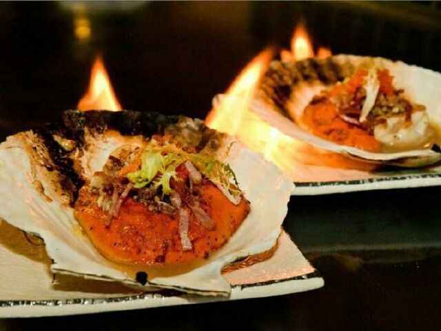 烈焰扇贝使用火焰类的表现形式。4只扇贝放在盘中,用伏特加、酒精点燃火焰,非常特别。
