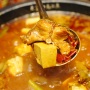 不同于酸汤,乌江鱼是炒制的辣味汤底,选用花溪辣椒和遵义的子弹头辣椒按比例加入姜蒜等打成贵州特产的辣糍粑辣椒后,再用猪油菜油混合炒香辣椒制作锅底,这样的汤汁煮鱼味道浓郁去腥,煮蔬菜醇厚入味,尤其是同样来自乌江的豆腐,建议一开始就多要一盘一直炖煮,到*后吸饱了汤汁就非常入味下饭。