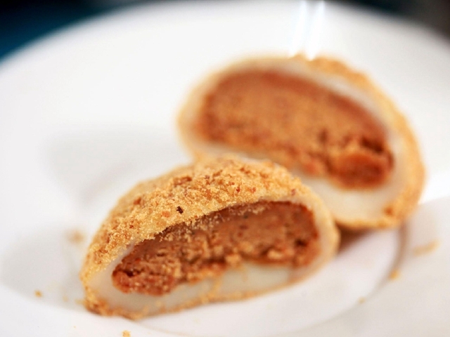 麻糬的颜色多变、小巧玲珑的外形看起来就很好吃。麻糬的外皮是用圆糯米或糯米粉为主要材料,以澄粉以及热开水为黏着剂作成的,口感一点也不粘腻,软软糯糯的感觉很赞,有咸口有甜口,滚上花生粉和芝麻粉的麻糬较为特色。