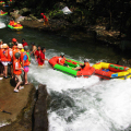 清远笔架山青龙峡漂流的一个特别之处是一年四季都可漂。原因是笔架山的漂流河建设有水源控制坝,它可以通过对水源的控制,保证山间突发洪时的漂流安全,并保证枯水季节漂流的适量水位。安全是漂流游人最关心的,笔架山的峡谷漂流在漂流全程的每一个惊险点,都安排有安全员守点,以帮助游人顺利过滩。 笔架山峡谷漂流分两段,上游是勇士漂,下游为逍遥漂,采用的漂流船都是2人橡皮艇。逍遥漂全长6公里,需时约2个小时,这段河道的状态较为和缓,落差一般在1米以下,正常水深40-50公分,各种滩跌洄潭,均在大众能够接受的范围内,适合各种年龄层次的人玩。不过,逍遥漂也有几处险滩,都是有惊无险的。两岸青山绿水,在逍遥中一边享受惬意的漂流感觉,一边自由自在地欣赏溪河美景,流连于碧水青山、绿荫白瀑之间。玩逍遥漂只需穿带救生衣。而参加勇士漂就惊险得多了。