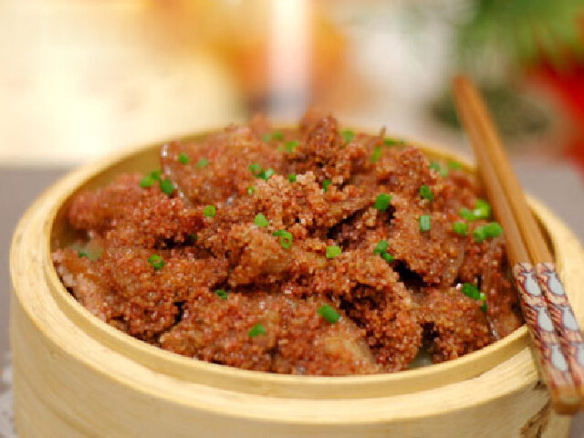 蒋大顺粉蒸肉酥烂香软,油而不腻。肉是肥瘦相杂的五花肉,切成长方形,先冷水后温水再净布敷干,还需用刀背在肉上横批。上好料的肉片用小瓦锅盛放,大火先蒸一小时,稍加冷水,再小火焖半小时。如此繁杂工序,少一道就不是原汁原味了。