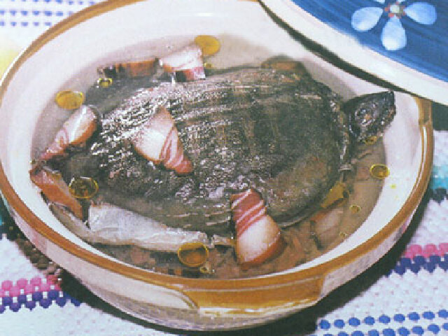 将甲鱼块整齐地码在沙锅中,把火腿、葱、姜和火腿骨围在甲鱼四周,加入鸡清汤和绍酒,盖好锅盖,旺火烧开后,去除浮沫,放冰糖,转用微火炖1小时左右,拣出姜和火腿骨,放盐,再将火腿捞出切成片放入锅里,淋上熟猪油,撒入白胡椒粉即成。