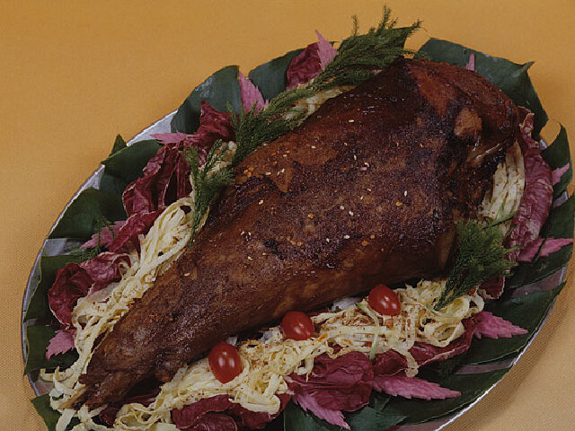 烤羊腿是蒙古族名菜,是从烤全羊演变而来.相传,生活在中国北方广阔大地上的狩猎和游牧的民族,常在篝火旁烘烤整只的猎物和整羊进食.人们逐渐发现整羊比较好吃的部位是羊后腿,便经常割下羊后腿烘烤.单独烘烤的羊后腿不但比烤整羊时间快,而且更加味道鲜美,食用方便,烤羊腿遂逐渐代替了烤整羊