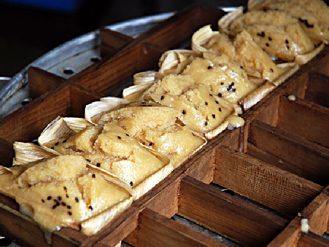 原料/调料: 粘玉米面3杯,粳米面7杯,盐1/2大勺 豆沙-红豆5杯,盐1大勺 制作流程: 1、将粘玉米泡一天左右,除水份磨成面加盐,并用筛子筛好,如果太干可以加些水. 2、按粘玉米面3:粳米面7的比例混合. 3、扔掉第一次煮红豆的水,再倒水煮熟后扔水并焖出来. 4、把蒸好的红豆洒在大盆里,放点盐,用勺子压碎并做豆沙. 5、在蒸锅里铺一层豆沙,再铺一层面,如此反复. 6、麻布包沾水盖好,并在强火中蒸20-30分钟.把筷子插进去,不沾生面表示已熟