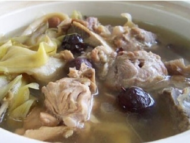 材料:罗汉果、白菜、排骨、南北杏仁、蜜枣、陈皮、盐等。