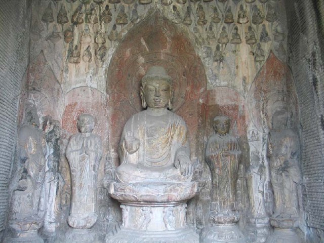 洞内主佛为阿弥陀佛,面相丰满圆润,两肩宽厚,简洁流畅的衣纹运用了唐代浑圆刀的雕刻手法。主佛施“无畏印”,表示唯我独尊。主佛端坐在莲花宝座上,那奋力向上的雄姿与主佛的沉稳形成了鲜明的对比。主佛背后还有五十二朵莲花,每朵莲花上坐有一菩萨,她们或坐或侧,或手持莲花,神情各异,像是不同少女的群体像。