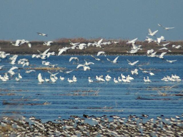 南矶山国家级湿地自然保护区是水鸟迁徙线路聚集点,各种候鸟自由飞翔。丰富的物种资源使保护区成为候鸟的乐园。在这里,万羽竞翔,美不胜收。据统计,保护区鸟类约215种,数量在10万羽以上。国家一级保护的候鸟有白鹤、黑鹳、金雕等;国家二级保护的候鸟有白额雁、灰鹤等,这些候鸟9、10月份从新疆等地迁徙到南矶山,度过一个暖和的冬天,第二年3月离开。白鹤是一种大型迁徒性涉禽,全身羽毛纯白,历被人们作为吉祥和平的象征。