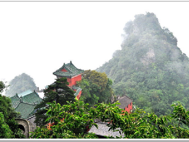 殿下的山峰腰绕石城一周,名紫金城,临崖面险,悬空熊峙,四门石阙巍然屹立,极其险峻。登上金顶,远眺群峰环峙,丹江水库碧平如镜,俯瞰太和、南岩、五龙诸宫,层叠有致,美不胜收。晨观日出,晚看云海,游人至此,如至仙境一般。在武当山的小莲峰有一座明永乐十四年铸造的铜殿,这是中国现存最早的铜铸建筑物。