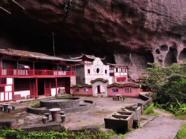 进入普陀岩,会见一木质庙宇依岩而建。沿着山径和溪流直入峡谷,就会到达罗汉岩。拾级而上,有一古桂立在此处,秋天的时候,花香四溢。穿过鸣春桥,就是后岩了。后岩是龙凤岩的主体,岩在中峰下,溪壑、石壁,左似游龙,右像飞凤,甚是壮观,故而岩洞和寺庙都叫龙凤岩。入春以后,岩顶的飞泉瀑布如青雨纷飞般落下,所以岩、寺又叫青雨岩、青雨寺。