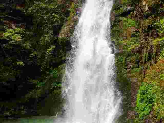 “马撒尿”瀑布是一个奇特的“间息瀑布”,瀑布的垂直落差有82米,瀑布水每隔几秒就会“哗”地一声涌起数米高的白浪,然后就会像一匹白练轻扬而下,然后洒下悬崖,归于平静;几秒钟后再次涌起,如此循环往复。“马撒尿”瀑布的奇景引起了游人极大的兴趣,当地人给了它一个通俗但形象的名字—“马撒尿”。瀑布的右侧有一观虹台,伫立其上,当阳光照射瀑布时,你就会惊喜的看到一道彩虹显现在瀑布之中,"马撒尿"瀑布和其间的彩虹便是金狮面景区的两大奇观。