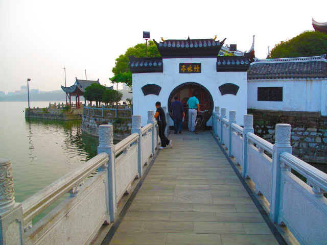 九江琵琶亭临江背湖,因白居易在此作了《琵琶行》,而得此亭名。琵芭亭是一座中国古典园林建筑,主要由亭、台、楼、池、圃组成。琵琶亭耸立在醒目的高台之上,粉墙青瓦,气势雄伟。亭下方有一汉白玉的雕像,便是白居易。其后有一方池,池后有一石台,左右用石阶相连。石台的照壁上嵌着毛泽东手书的《琵琶行》。亭院两旁是碑廊,碑廊里镶嵌着历代诗人题咏琵琶亭的碑刻。