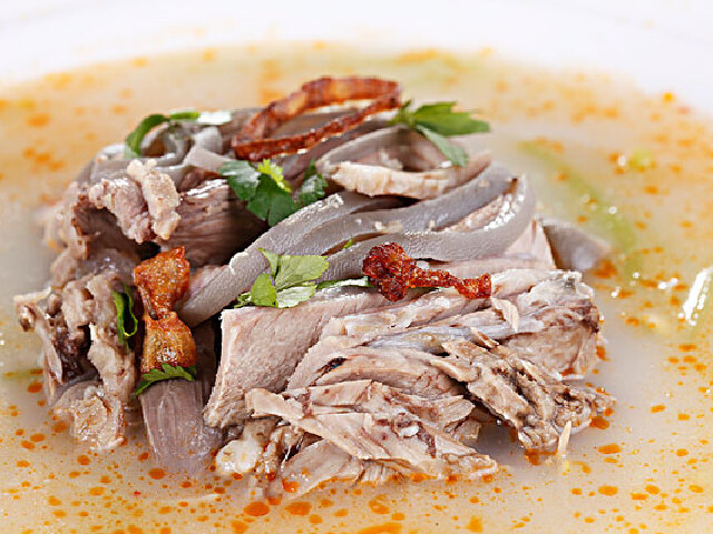 以肥嫩羊肉、牛肉、鸡丝为主要原料,配以大麦仁及多种作料制成。