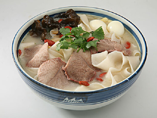羊肉烩面是河南著名的特色小吃,深受人们的喜爱.其汤,浓酽醇厚;面条,鲜香有韧劲;羊肉,鲜嫩酥烂.做羊肉烩面有三要素,面、料、汤.和面的时候要放一些盐,揉成团后醒二十分钟,然后再揉十分钟,醒二十分钟,反复3-4次,抻出的面条才有韧劲.其配料丰富,包括羊肉、粉丝、木耳、黄花菜、豆腐皮丝、海带、鹌鹑蛋等.较为关键的是熬汤,选用上好的羊肉同羊骨架加上各种香料文火长年熬制,熬制汤白肉烂