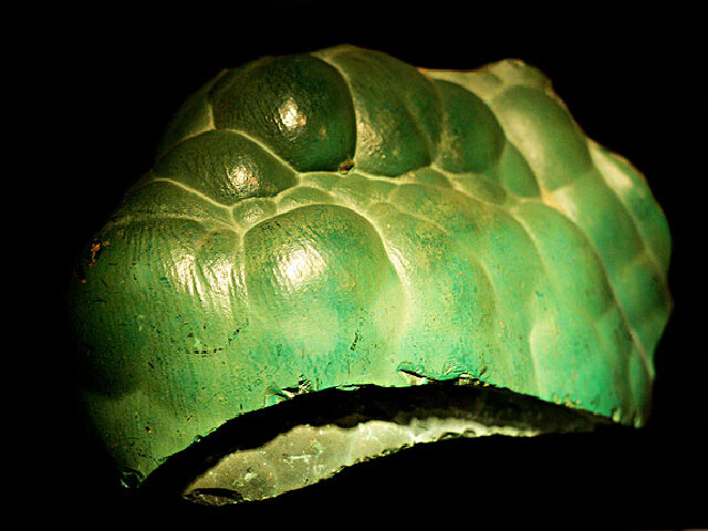 中国古代称孔雀石为“绿青”、“石绿”或“青琅玕”.孔雀石是一种古老的玉料和颜料,早在公元前十三世纪的殷代,中国人就用孔雀石制作玉簪等工艺品;而传统中国画中的颜料-----蓝色和绿色,就是用蓝铜矿(石青)和孔雀石(石绿)做成的.孔雀石的主要产地有俄罗斯、澳大利亚和巴西等.中国的孔雀石主要产地在广东阳春和湖北大冶的铜绿山(今黄石市辖区).然而谁会想到,这个标志着人类走向文明的中国青铜文化发源地竟然就是湖北大冶的铜绿山.据清修《大冶县志》记载:“铜绿山在县西马叫堡,距城五里,山顶高平,巨石对峙,每骤雨过后,有铜绿如雪花小草点缀土石之上,在铜花草之下有铜矿或孔雀石.”上世纪八十年代初,大冶铜绿山矿在开采铜矿时发现了一个“古矿冶遗址”,后经国内外专家鉴定为三千年前的“古矿冶遗址”,被专家们誉为矿冶“奇观”,并被学术界称之为“世界第九大奇迹”.1994年,铜绿山古矿冶遗址作为中国唯一一处被列为全国重点文物保护单位的古铜矿遗址,深受世界瞩目