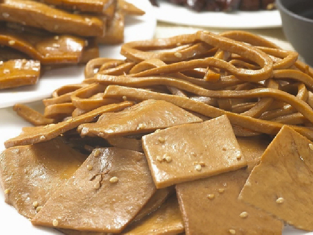 通城豆腐干是咸阳的特色美食,是利用豆腐干撒上一些芝麻,经过精制而成的。味道醇香美味,颜色偏黄,十分好吃。做法也是各种各样,可以作为佐酒小吃,也可以煮汤、烧烤等。 原料:豆腐干、食盐、茴香、料酒、姜、芝麻等。 营养价值:同城豆腐干富含大量的蛋白质、脂肪等,还具有人体所需的矿物质。因此营养十分丰富。 适宜人群:老少皆宜。