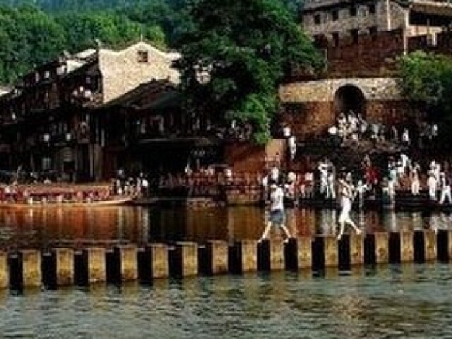沱江跳岩的墩是红砂石制作成的,两个桥墩相距5米左右,上面铺上木板,再用铁链绑在一起,固定在铁桩上,防水冲走。从跳岩中间来眺望沱江,可以欣赏的凤凰古城的美景。