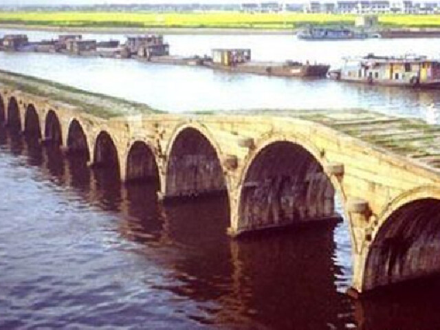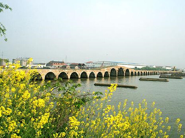 宝带桥为中国十大名桥之一,全桥由坚硬的金山石建造而成,共有53个桥孔,是我国现存的古代桥梁中比较长的一座多孔石桥。宝带桥始建于唐朝,是大运河和澹台湖之间海运通畅的必要条件。宝带桥制造极为精巧,周有青山绿水相得益彰,更显得其如一条宝带婉卧于水面之上。