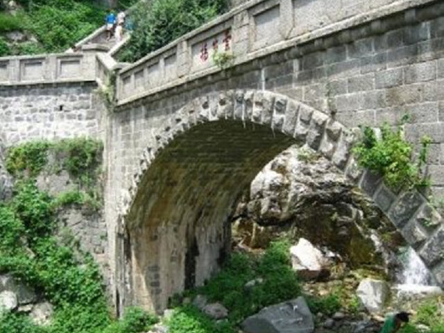 云步桥北面有大片陡峭的石崖,石崖上遍布题刻文字,如“红桥飞瀑”、“霖雨苍生”、“太古清音”等等,与一旁的云步桥瀑布壮观之景相得益彰。飞瀑之直下,如翠玉般闪耀,此乃是游人驻足小憩的绝佳之地。明代陈凤梧的诗中也以“百丈崖高锁云烟,半空垂下玉龙涎。天晴六月常飞雨,风静三更自奏弦。”等浩瀚的诗句来形容瀑布之壮景。