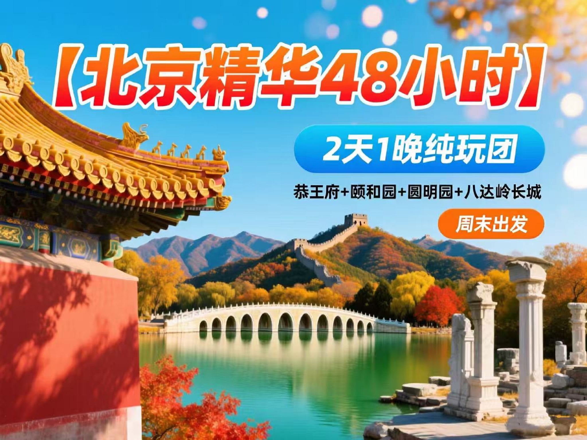 <北京精华48小时2天1晚纯玩团>一次打卡恭王府+颐和园+圆明园+八达岭长城丨周末出发丨一站式省心游