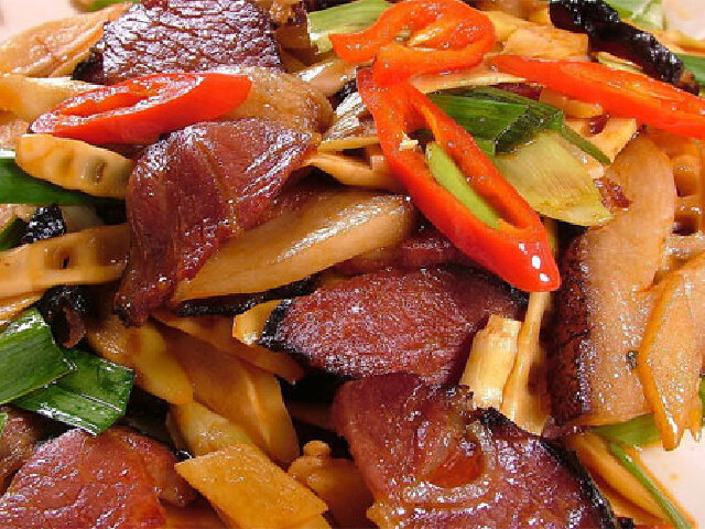 湘西的隔年熏腊肉跟我们平常的在腊月里吃的腊肉是迥然不同的。隔年熏腊肉的肉大多选择猪肉,有时候也会有人用鸡肉、狗肉,先用盐抹一遍然后用绳子穿过挂在灶头上方,接着就任由它风干了,一般需要风干半个月,时间越长,肉的味道、口感越好,由于主要是靠灶头的烟和温度加上风,久而久之肉的表面就会黑黑的的,满是油渍,所以不能直接食用,首先要将它烧一会然后 浸泡在淘米水中用稻草或是其他的工具搓干净,然后你就可以看见它的真面目了,配合葱、蒜、辣椒等作料爆炒一番,立马就能闻到熏腊肉的香味,这是一道非常好的下酒菜,菜虽好,可不要贪杯哦!