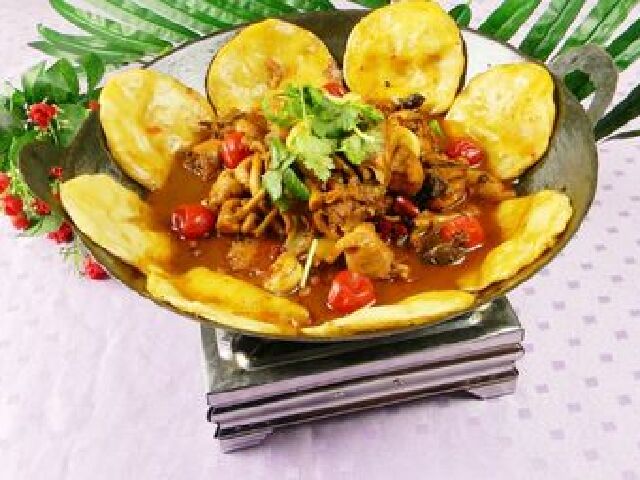 地锅鸡的主料是鸡 ,配以土豆,面粉和葱姜蒜等配料,现将活好的面分成荔枝大小的几个面团并用手压成面饼,然后用辣椒,葱姜蒜等调料炒香鸡块,等烧出香味后加入鲜汤和土豆,然后在锅子的四周贴上博饼,待博饼熟透即可。地锅鸡香气扑鼻,饼借菜味, 菜借饼香,让人垂涎三尺。 鸡肉的肉质细嫩,有滋补养身的作用。 以前徐州人都在自家小院里用石头垒灶,放上一口大铁锅,放入菜煮熟,贴上锅贴, 一家人围炉而坐。现在的厨师将其改造变成现在的地锅鸡。地锅鸡味道鲜美,适合一年四季,鸡肉鲜嫩老少皆宜。