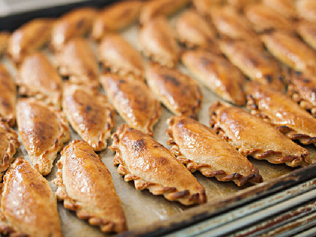 把肉丁、细香葱、葡萄干、马铃薯块、热沙司和胡椒粉裹在面团里烘烤