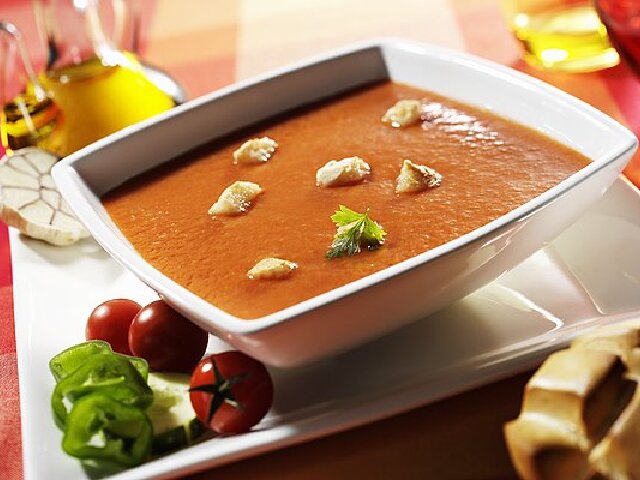 在热情似火的西班牙,略带辛辣的西红柿冷汤一定会给你不一样的感受。这带菜使用西红柿、洋葱、蒜头、面包、橄榄油等材料做成。含有丰富的西红柿红素,是一道无须动火烹煮的特色菜肴。