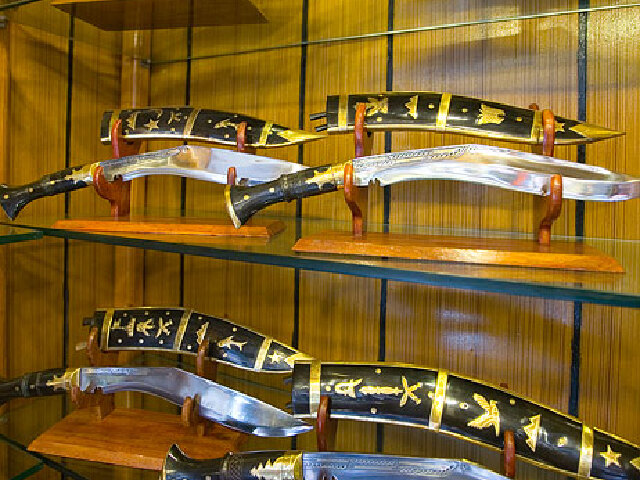 廓尔喀弯刀是尼泊尔的“国刀”,并且是库尔喀士兵的荣誉象征。上等的真品与纪念品有很大的区别,价钱决定于刀刃和刀套的镶嵌饰物和手工。杜巴广场上最多,但是品质良莠不齐,要谨慎购买,当然杀价也要狠些。