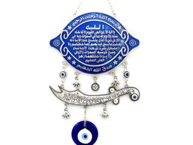 玻璃制品,土耳其传统避邪物,也是很有当地特色的纪念品:浅蓝或深蓝色的圆形玻璃片,中间有一点白色,上面再点一小滴黑色。当然也有很多变化,如镶在不同形状的外壳中或做成水滴形、爱心形等。