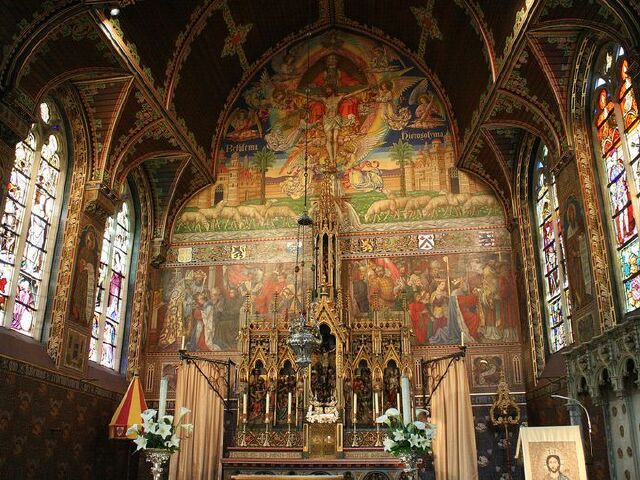 圣血教堂是布鲁日极富盛名的教堂。相传在1150年,第二次十字军东征时期,耶稣的圣血被人耶路撒冷带回布鲁日城收藏,圣血教堂因此而得名。此举惠及了布鲁日这个城市,它渐渐繁荣起来了。 圣血教堂坐落在伯格广场(Burgplatz)西南侧的一条巷子里,你没法错过这一座二层高的建筑,不仅因为它精雕细琢的正立面,更因上面金光闪闪的多尊圣象。教堂的底层是12世纪建造的罗马风格礼拜堂和纳骨唐,楼上则是19世纪改建的哥特式礼拜堂和教堂小博物馆。