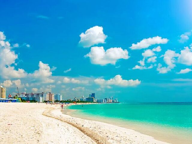 迈阿密海滩是美国著名的海水浴场,也是全世界名列前茅的观光胜地,它位于迈阿密的海滩市,与迈阿密隔着比斯坎海湾相望,有几座跨海大桥与之相连。这个海滩海水浅,浪小涌平,沙细沙白,平坦广阔,延绵数公里,像一条长长的宽大白色玉带镶在海边,一眼望不到头。