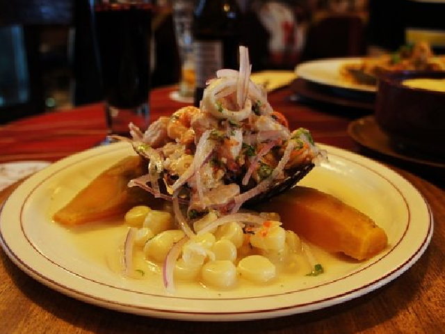秘鲁的美食拥有自己独特的风格。秘鲁渔业发达,用新鲜海产制作的各式美味菜肴让人赞不绝口,这一道ceviche凉拌海鲜就是秘鲁被推荐过较多次的名菜了。用酸柠檬汁和鲜洋葱腌制的各种生鱼肉虾肉蛤肉,非常非常酸,非常非常鲜,口感爽脆。