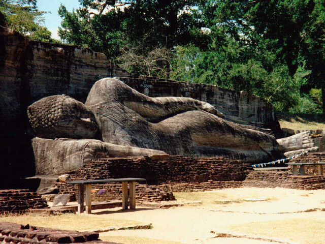 伽尔寺是由不知名的艺术家在一整块巨型花岗岩石上雕刻而成,包括前后相连的三大佛像和一座佛龛。伽尔寺的佛像象征着斯里兰卡古代艺术的巅峰之作,气势雄伟,刻画得出神入化。伽尔寺是东古城极热闹的地方,因为这里给信徒们提供了极值得顶礼膜拜、较能够表现佛陀神迹的象征。伽尔寺的卧佛长14米,刻画了佛陀涅槃的场景,描绘了进入极乐世界的安详。而且这些佛像本身所具有的强烈美感和巨大的形象使得大家不禁驻足良久,流连忘返,而且即使离开很久之后也难以忘怀。为了保护石像不被破坏,斯里兰卡政府将伽尔寺用铁皮架围住了。