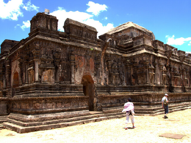 睹波罗摩佛殿是东古城三大砖制无量佛殿中较古老的,也是保存较完整的。厚重的砖制外墙被灰泥粉饰,并装饰着建筑浮雕。这种有点类似于印度神庙或欧洲皇家花园中花房的建筑形式是东古城所特有的,极具观瞻价值。