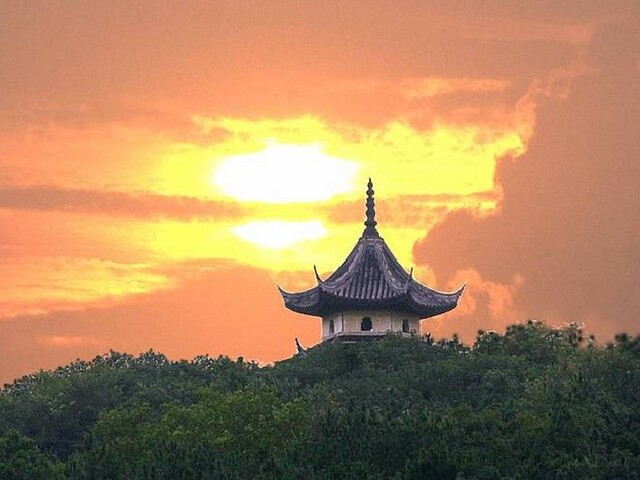 虞山辛峰地处于东岭,高约八十米,建有六角砖亭,始建于宋代,夕阳西下之时,余晖照在尚湖之上,景色蔚为壮观,成为了虞山十八景之首的“辛峰夕照”。辛峰东面依山而建仲雍,言子两墓;南麓是昭明读书台;北麓是虞山公园。园依照山势而建,引溪为池,以九曲桥和湖心亭为主要景点,优雅僻静。