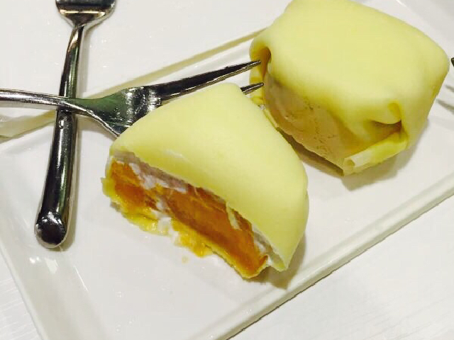 芒果班戟味道很香甜,切开就是一整块的芒果,上面一层奶油,让人直流口水。