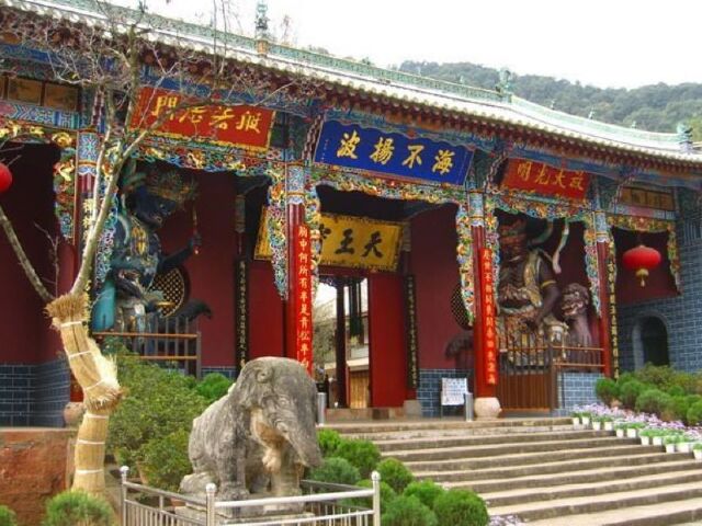 太华寺的天王殿是一座单檐式建筑,大殿高近20米,占地三百六十多平方米。在天王殿的正中有一座站立在莲花神龛上,木雕而成的观音像,双手合十,神态慈祥。在大殿的两旁有粉彩四大天王塑像,神态自然,不怒自威。在大殿内有一尊身披金甲,按剑踞地的护发王韦陀的雕像,神态威严,形象逼真朴实。