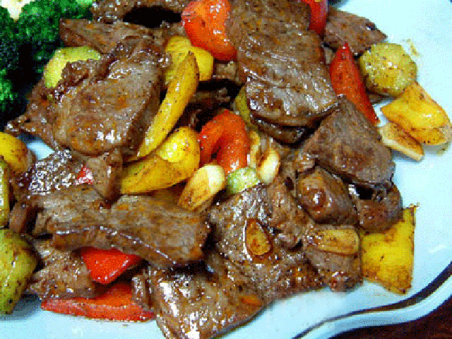 甘草霜烧牛肉在当地享有盛名,不仅因为它味道绝美,而且药用价值也很高。主要原料:牛肉、胡麻油、葱段、草霜、精盐、酱油、调料包、白糖、牛肉汤、味精。牛肉色泽红亮,肉烂汁甜,有润肺止咳之功效。
