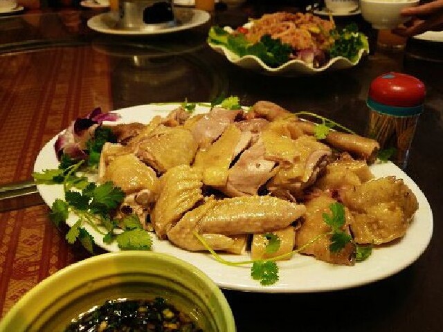 吴忠比较传统的菜肴。鸡宰净后整只冷水下锅,水开时撇掉沫子,把适当调料装在小布袋内放进去,不放盐和酱油,煮熟后即时取出。将鸡油用刷子遍刷鸡身,剁块装盘盖上葱丝、红辣椒丝,再用三花油(芝麻油、花椒油、少量酱油)一浇即成。此菜味道鲜美,质细肉嫩。蛋白质含量丰富,补充人体所需各种氨基酸。