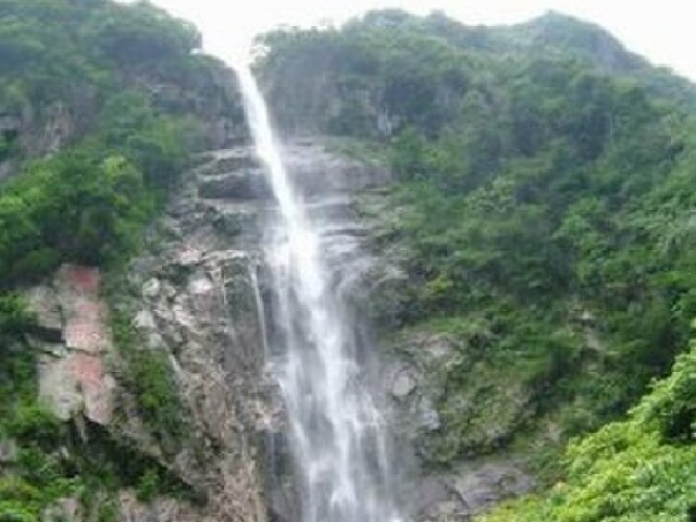 在明月山160米高的悬崖上,有一瀑布飞流直下,泻在两旁层层凹凸不平的峭壁上,如云如烟,轰鸣作响,溅起万千水珠。