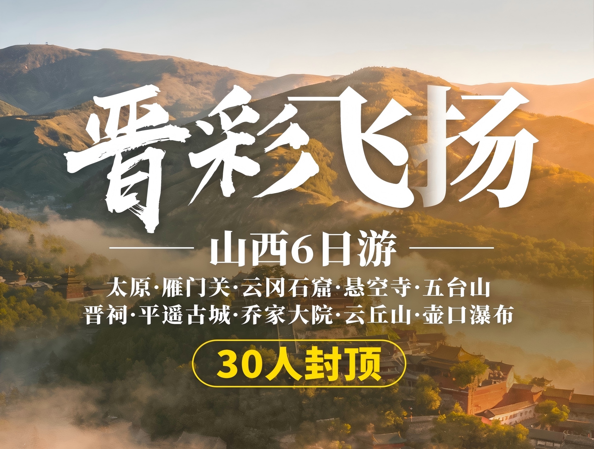<山西五台山+云冈石窟+平遥+壶口双飞6日>晋彩飞扬/小交通全含/赠平遥表演/纯玩无购物/八大5A景区/单人出行可拼住
