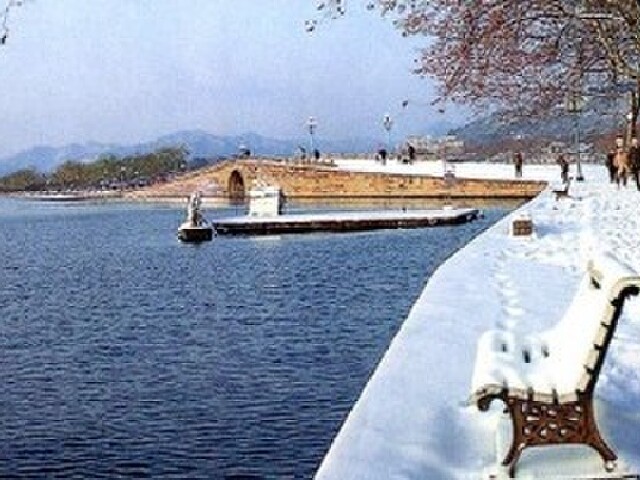 每当瑞雪初霁,站在宝石山上向南眺望,西湖银装素裹,白堤横亘雪柳霜桃。断桥的石桥拱面无遮无拦,在阳光下冰雪消融,露出了斑驳的桥栏,而桥的两端还在皑皑白雪的覆盖下。依稀可辩的石桥身似隐似现,而涵洞中的白雪奕奕生光,桥面灰褐形成反差,远望去似断非断,故称断桥残雪。